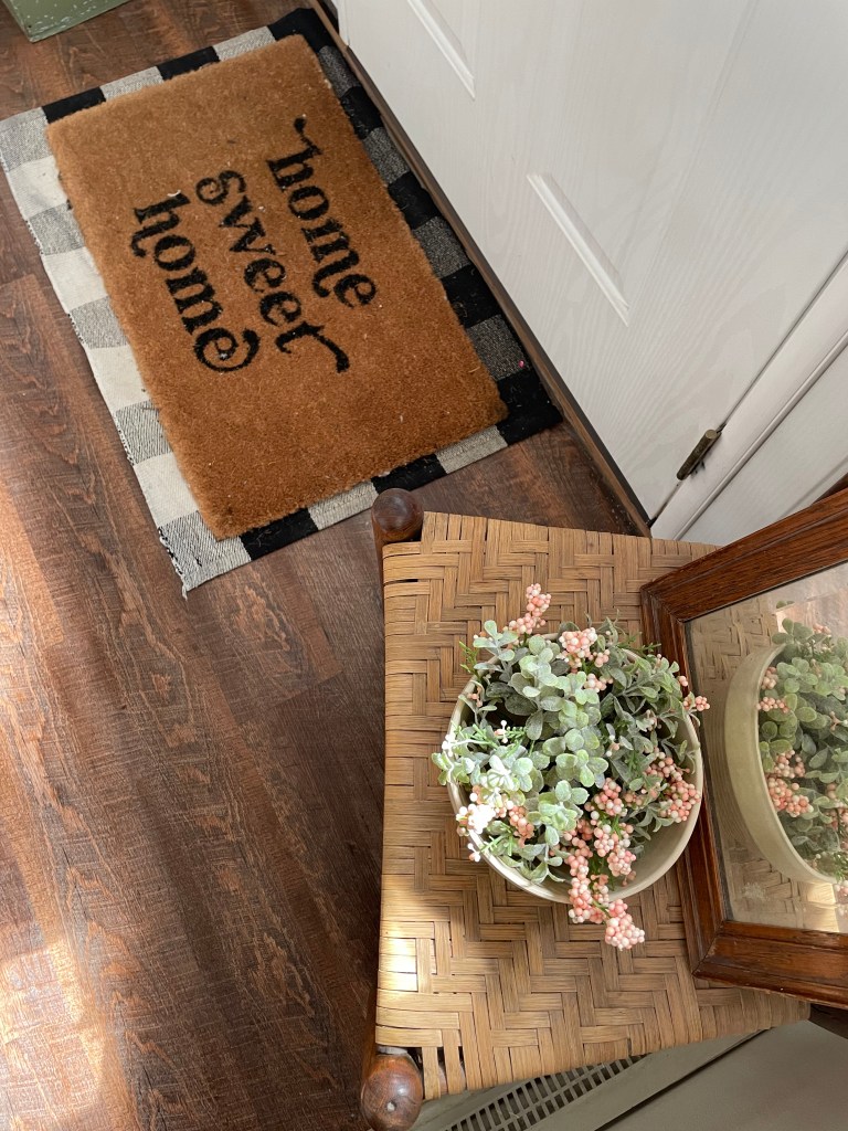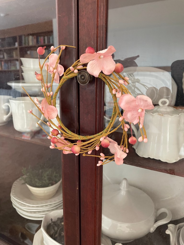 After lunch and during my daughter’s quiet time, the boys and my Sweet Husband went outside to do some nice sunny work, and I did some inside cleaning and decorating! When it comes to decor, I generally stick to simplistic. I like to add hints here and there to what is already around- including my favorite collections. I shop my house as well as a few bins in the basement, using mainly faux greenery and flowers.