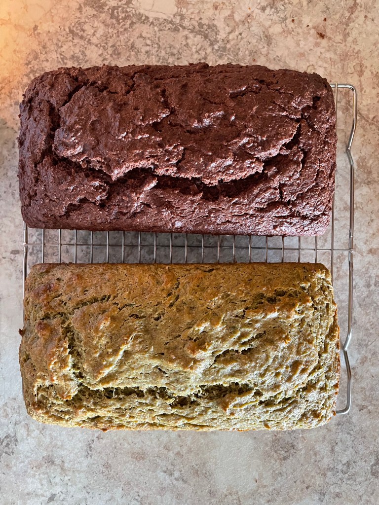I was able to bake two loaves of quick bread this morning, and made quite a lot of dirty dishes to go with them! One loaf was a Black Forest cherry bread with some of our homegrown sour cherries puréed. The second was a green Rhubarb bread for March 17th tomorrow! I am not usually one who goes all out for small holidays, but I already had the rhubarb (also homegrown by my mother-in-law) thawed, so I made it fun! Secret ingredient: spinach!