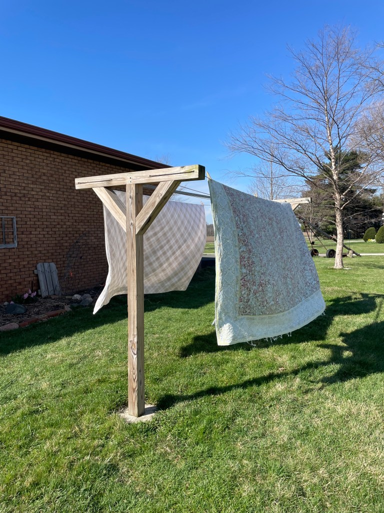 The sweet breads and chicken salad look scrumptious. Don’t you love the fresh smell of a quilt that’s been out on the line?!