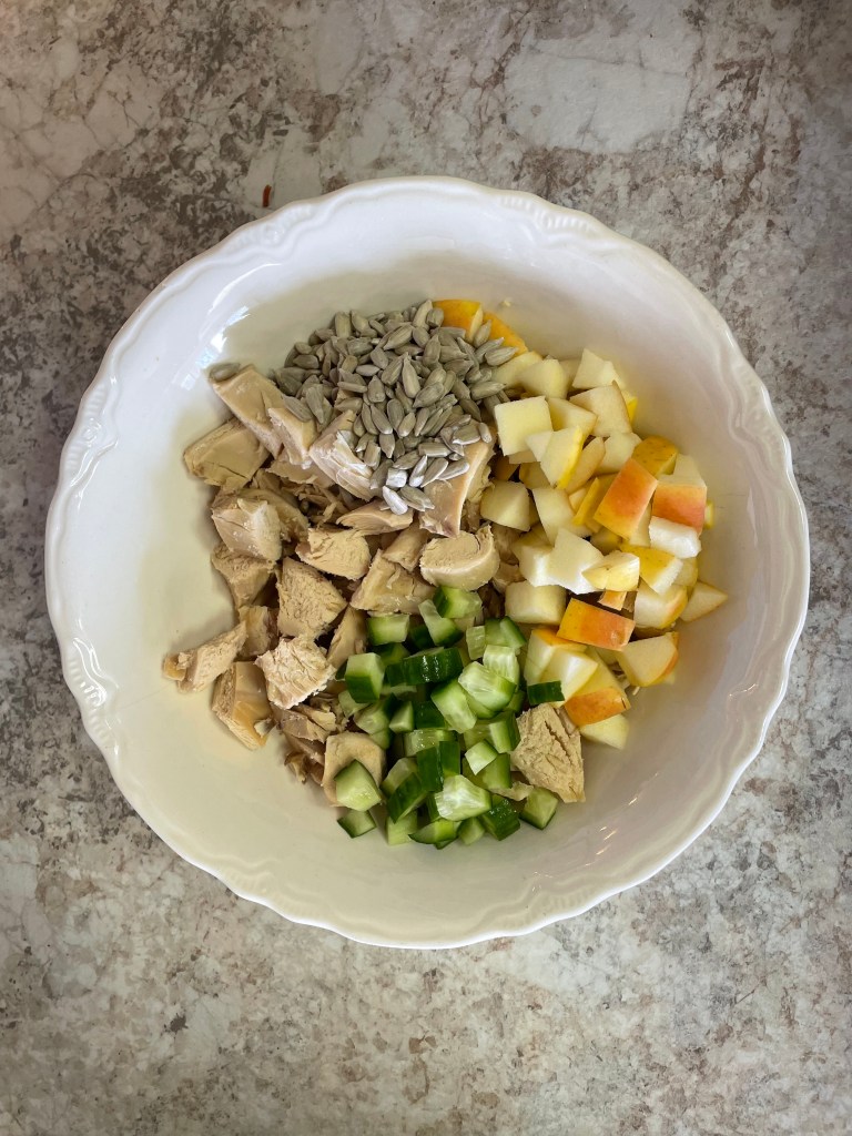 For lunch, I was tickled to whip up some chicken salad. To go with it, I made a package of tricolor tortellini and added a homemade alfredo sauce. We enjoyed the chicken salad on wraps or over lettuce, topping with raw sauerkraut. I tend to make my chicken salad the same each time (never measuring eek!), but sometimes I tweak it to what I have on hand. A friend gave me her recipe and I have sort of made it my own over the years.