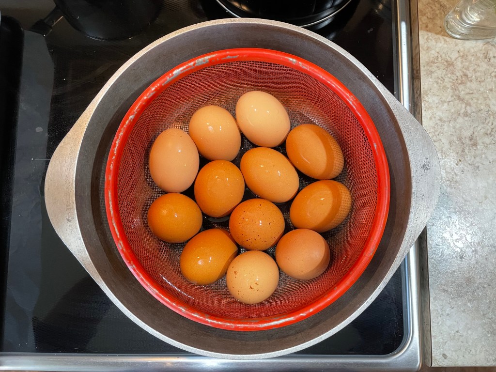 Place your eggs into a metal colander that fits inside your pot. For me, I can boil about one dozen at a time with the above set up. Fill your pot with only approximately 1″ on water. You don’t want the eggs covered. Bring the pot to a roaring boil. Then, put the lid on and reduce heat. You want the water to continue to boil, but you don’t want your lid to flutter around. Set the timer for 20 minutes.