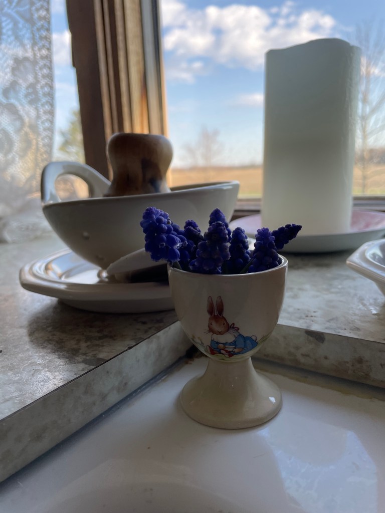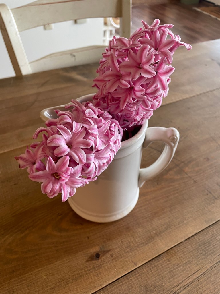 On my way back up to the house I noticed more lovely hyacinths blooming. Two were leaned over on the ground so I picked them and put them into my favorite Ironstone pitcher. ‘Drink them in, Marilla.’ (Name that book!)