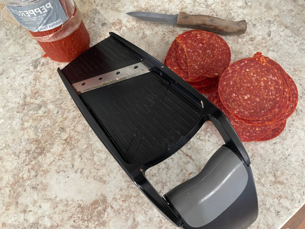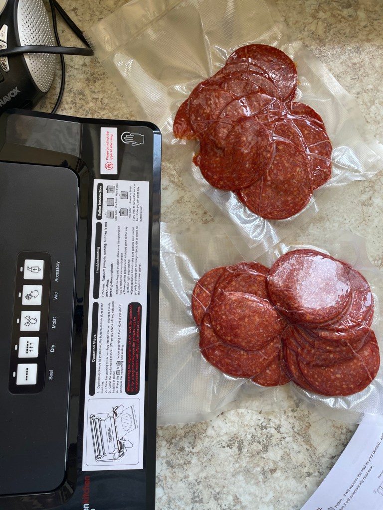 11:55 am The kids and I wanted homemade pizza (sourdough, anyone?!), so we got out a bulk block of pepperoni I bought at our salvage store locally. I used my mandoline and sliced it with the ‘thin’ blade. The slices were perfect! We used some on the pizza, saved some in the fridge for sandwiches, and used my new vacuum sealer (thanks to my Dad for his Christmas gift to me!) to freeze the remainder. I was thrilled!