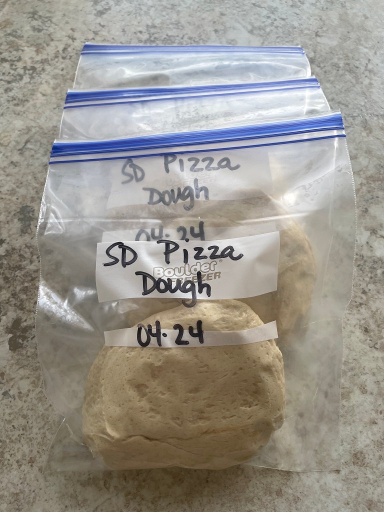 5:52 pm After rising several hours, the sourdough pizza dough (second batch) was ready to divide and freeze for later. This recipe from Better Baker Club on Pinterest has been excellent!