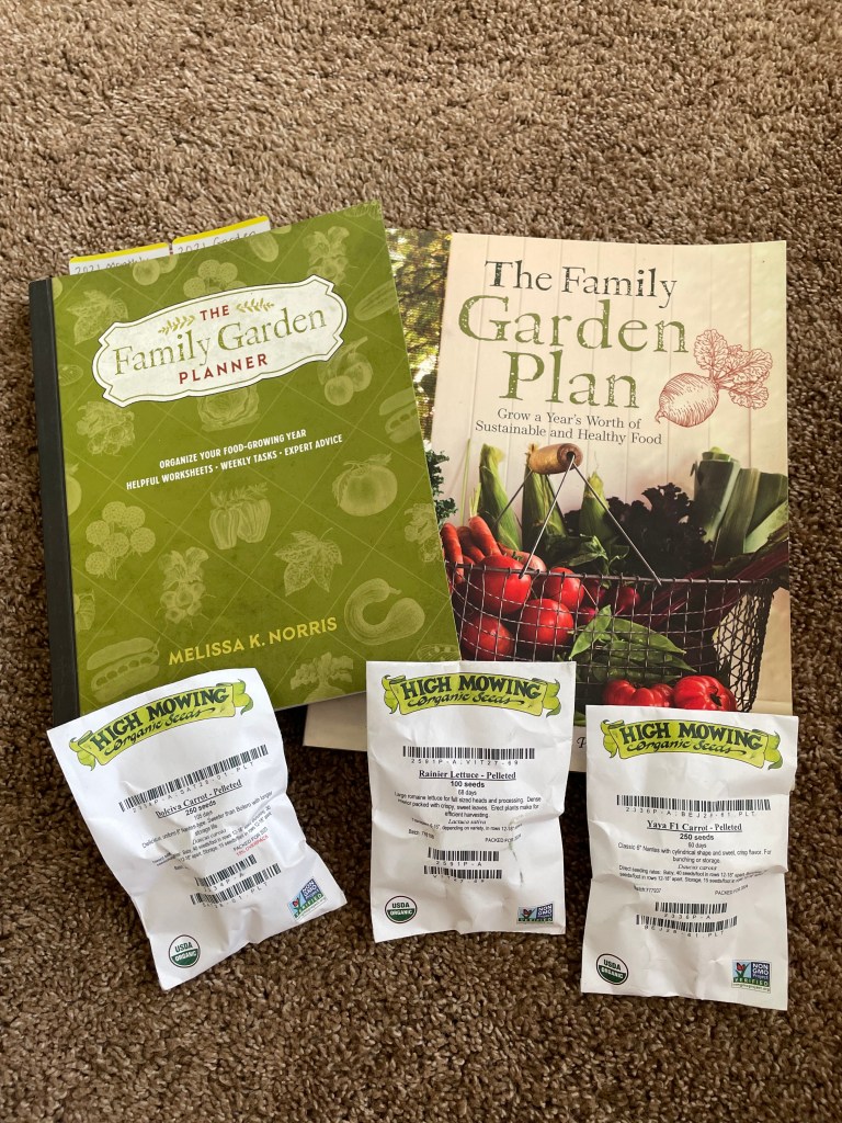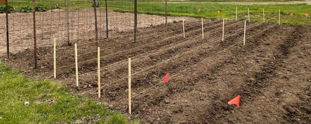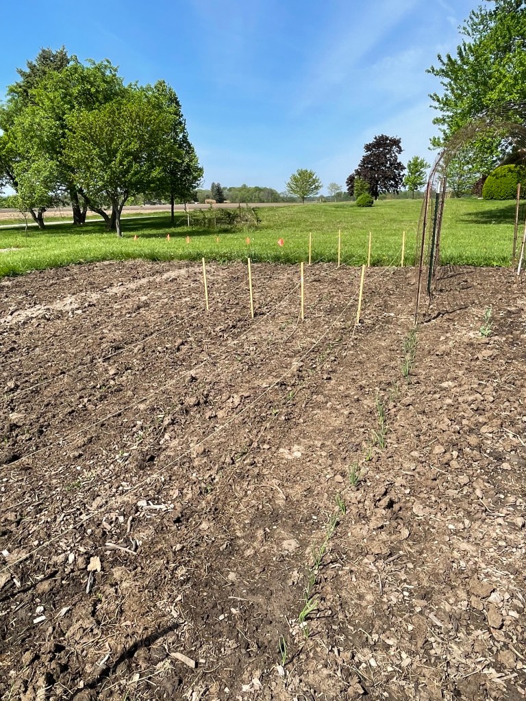 I am very thankful for the kids’ help. We put up the green (pole) bean arches together. That meant getting the coils of rebar we use for arches plus ten T-posts out from the barn. This year we are trying the posts about 4 foot apart- a nice arch, but not as much ground underneath that may go to waste. I plan to get some brassica plants this weekend at the local nursery and add near the broccoli. We also put some wooden stakes in for the shell peas to trellis onto. Unfortunately, rabbits or something came and chewed through our twine. I’ll have to restring the bottom rows of twine and add some tin foil pans to deter said rabbits and their friends.