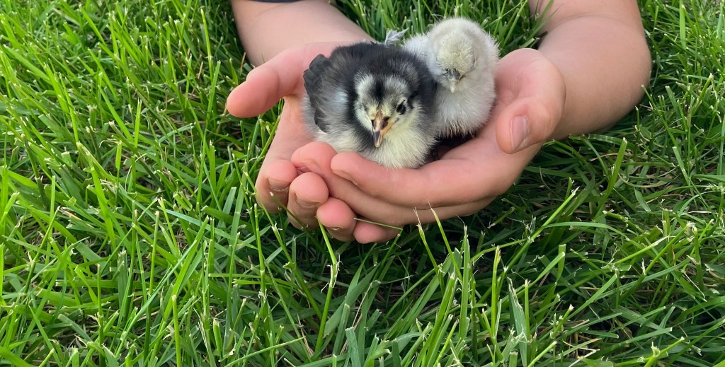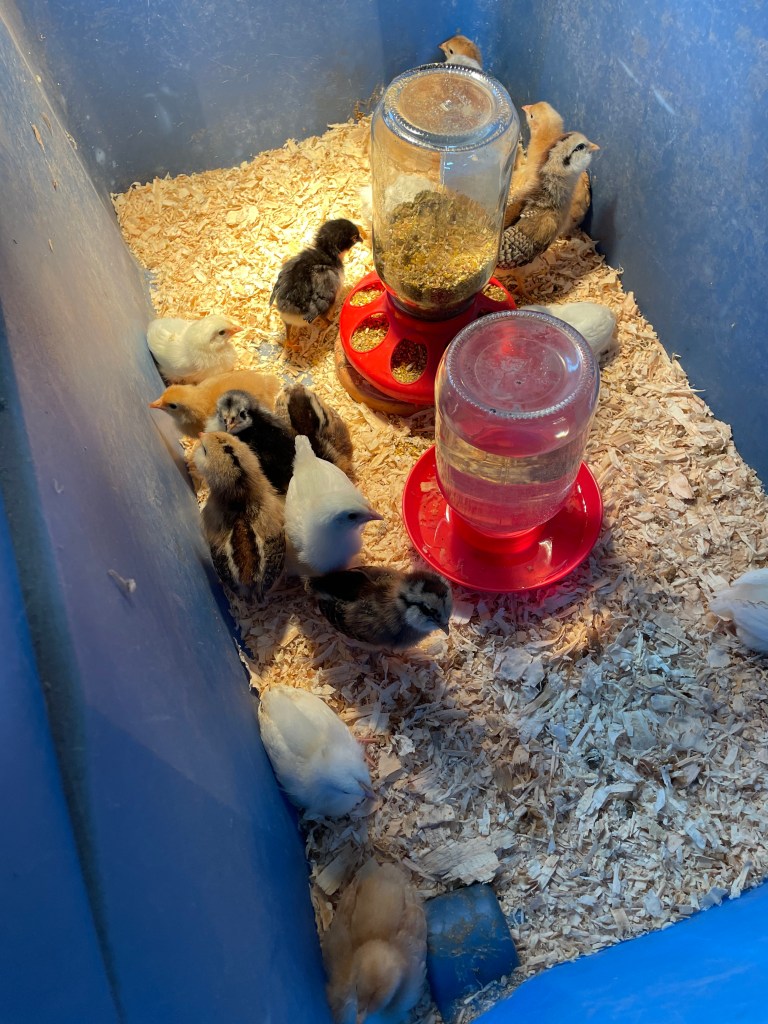 Chicks don’t need a ton to grow and flourish. The basics- food, water, and shelter, plus light (heat lamp)- are all they need. We use a pine shaving bedding and small feeder/waterers. Whenever possible, I get non-GMO food. It isn’t organic, but it also isn’t genetically modified. Our local Amish feed mill offers several livestock varieties of feed. Their prices are very reasonable and even less than the farm stores near us. You want to begin with a chick starter crumble. Then, once they’re outside and in their coop, you can move to a layer crumble or pellet.