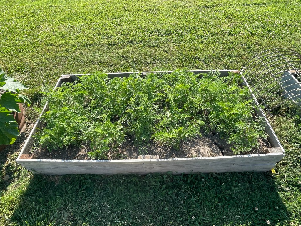 The raised of carrots has finally taken off and I’ve stayed on top of weeding and thinning. Our raised bed of zucchini has already produced three small fruits! We will eat those this weekend!