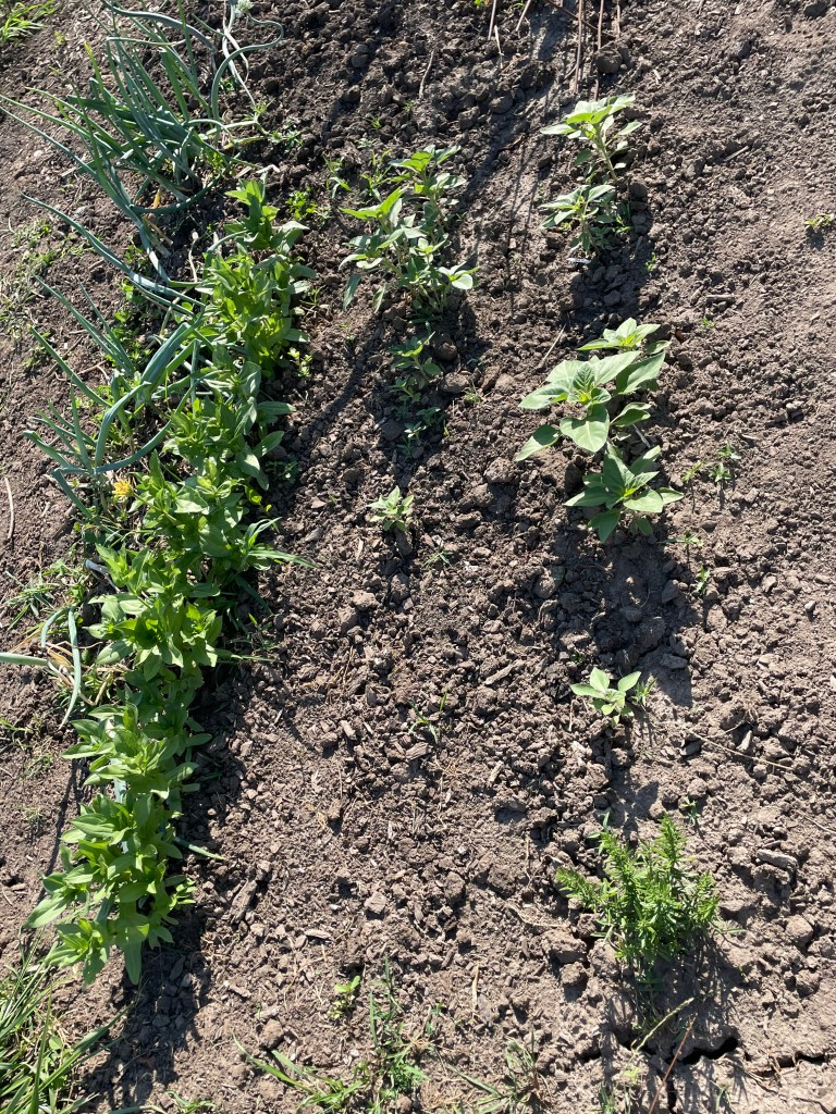 Our onions are falling over already, I am not sure why. The rosemary hasn’t grown a lot but is healthy. And our flowers have started showing signs of buds! We have had to weed and use the walking hoe quite a bit, but overall our garden appears to be healthy and thriving. We only use a fish emulsion fertilizer on occasion for our organic style gardening, but otherwise, we water when there isn’t rain, weed as needed, and mulch! No other powders or sprays etc.