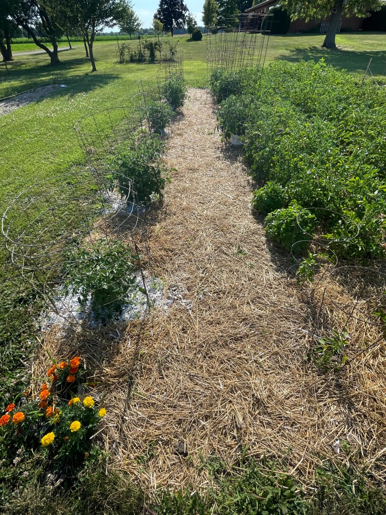 Marigolds are a beneficial flower to tomatoes. We also planted basil (2 plants) and peppers in this row. Some of the banana peppers aren’t as healthy looking as I’d like. My pepper seedlings did not live and so we had to purchase some at a local greenhouse. I planted 3 banana pepper plants and one red bell pepper plant. We mulched with straw and shredded paper.