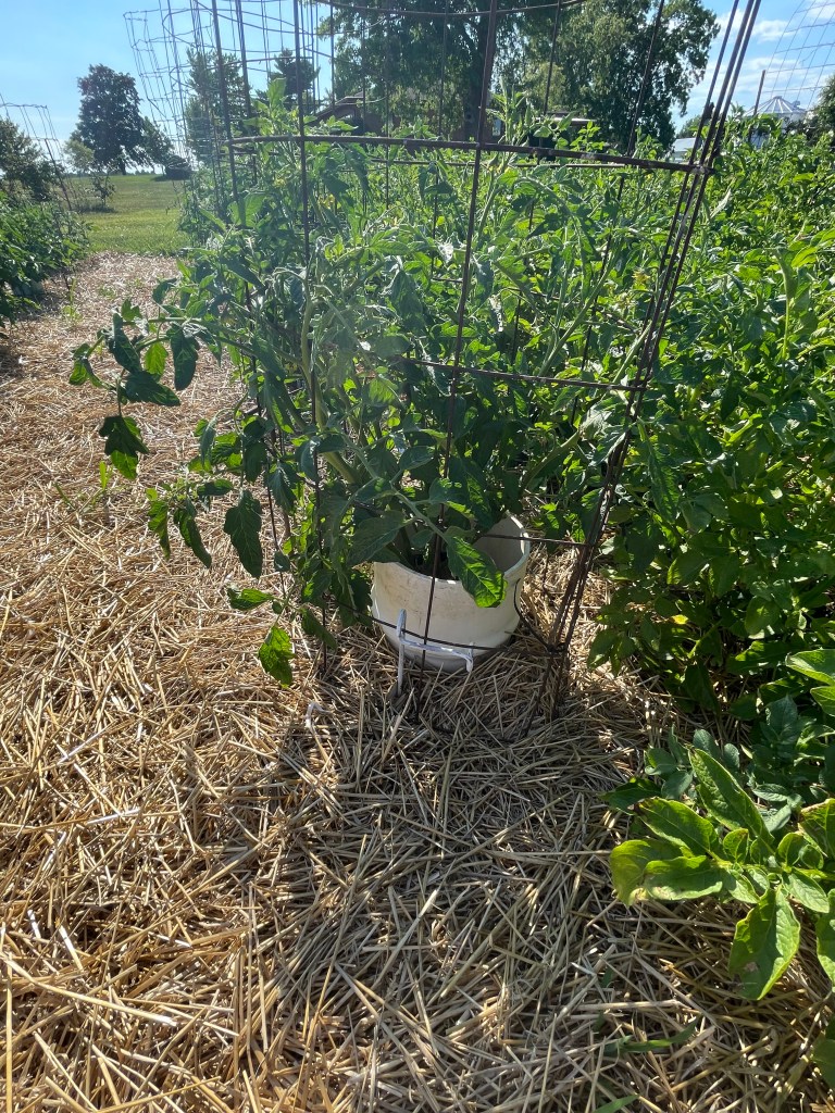 Our tomatoes are thriving and I couldn’t be more pleased! We have 13 plants (one being Cherokee Purple and the remaining 12 are Roma) that I began from seed! It is such a proud moment when you see thriving plants that began as a tiny seed in your basement. The single is an indeterminate variety (above) and may get very tall and bushy. The others are all determinate and will hopefully stay put. We plant them and put small protectors around them. My mother-in-law has always done this and I have found it very helpful. We reuse the cages every year and in the the fall, the cages protect our baby fruit trees.