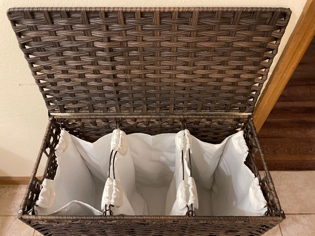 I do usually sort our laundry. This cute hamper has come in handy and actually holds quite a bit more items than you’d expect by its size. We sort: brights, darks, and whites. There is always overlap, but generally speaking those are the categories I use.