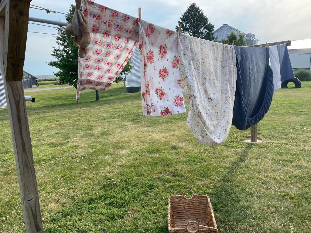 Line drying is a favorite for me! My Sweet Husband made this clothesline for me with no printed plans for Mother’s Day one year and it has been amazing. We love the smell of the sheets as we go to sleep. And the nubby feeling of line dried towels can’t be beat. On top of these wonderful aspects, it is also an energy saver- I do not like heating up my house in the sunny days of summer. There are many DIY building plans to be found if you are handy. There are also purchase options that are helpful and won’t break the bank. We had a similar umbrella style clothesline when we first got married that worked for many years before I got the ‘T’ style line.