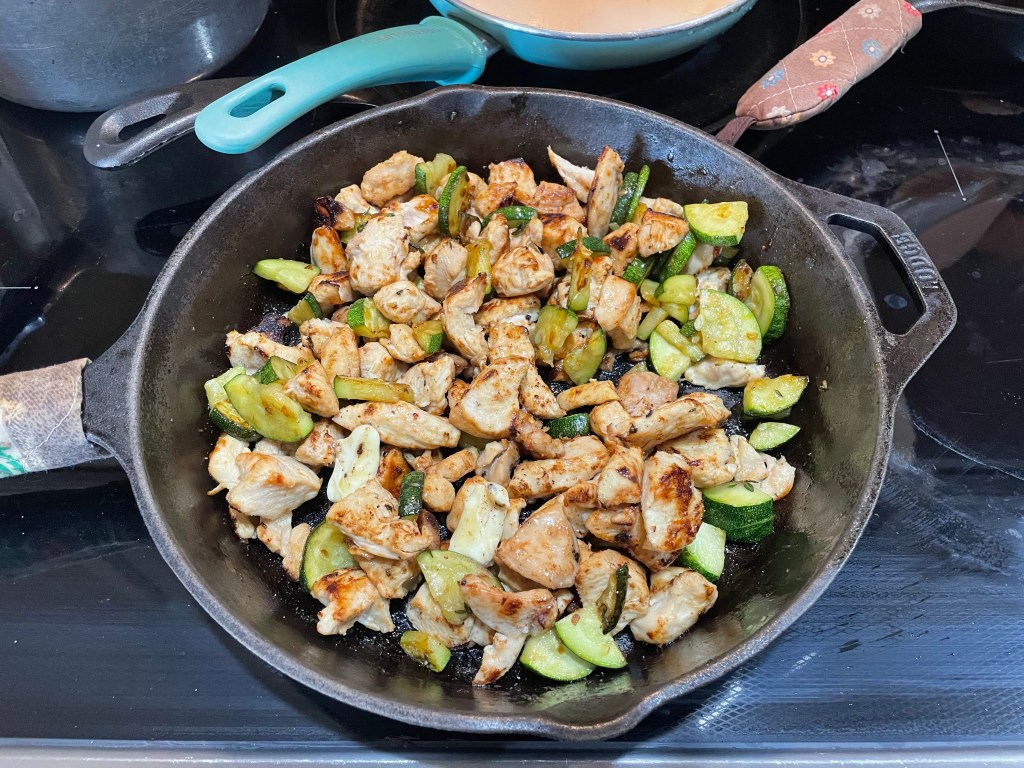 As things come in fresh from the garden, I try and use them fresh as well as preserving. Zucchini is one we put into dishes in many ways. I love skillet chicken, adding garlic, salt/pepper, a fat choice (butter or bacon grease usually), and veggies!