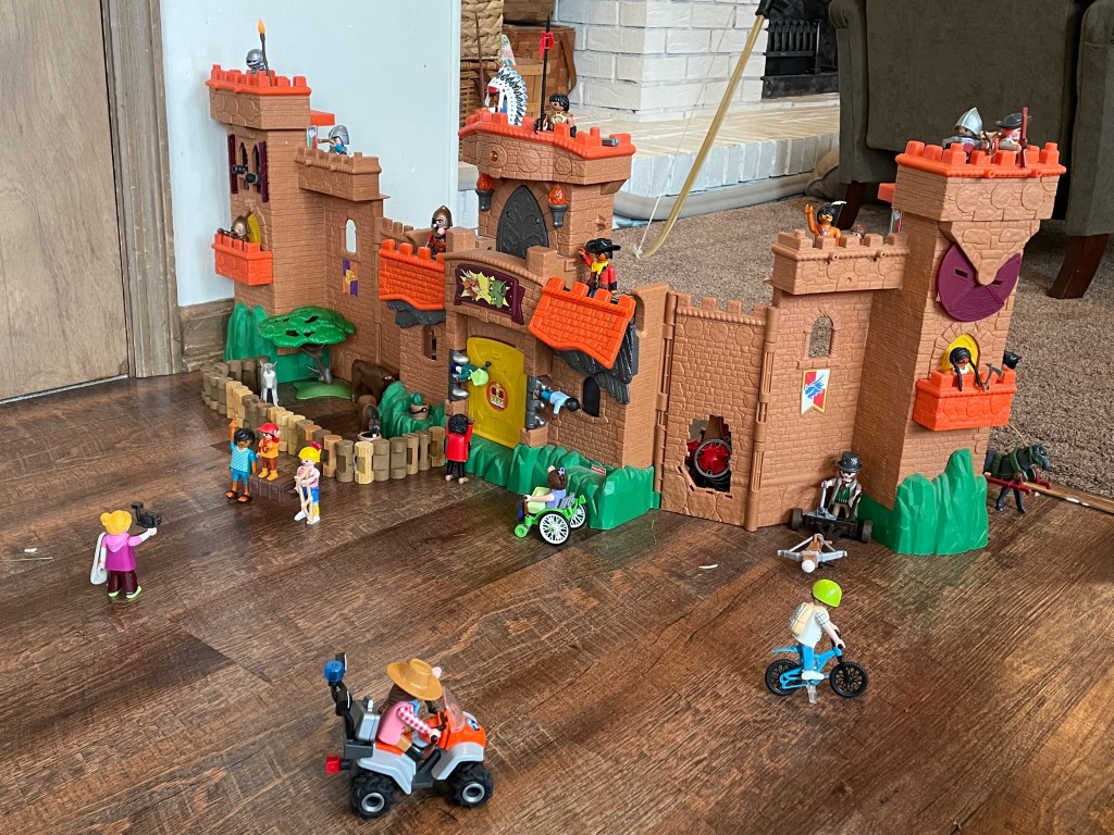 Inside or outside, a lot of play goes on around here. My three kiddos are all independent players as well as enjoying time playing together. Outside, they like playing Cowboys and Indians, Pioneers, and things like sidewalk chalk or water balloons. Inside, they play Legos, Lincoln Logs, PlayMobil, dolls (my daughter), puppet shows, and dress up. Note the play bow in the background of this photo. If they’re chaperoned, the boys enjoy BB gun and bow/arrow target practice.