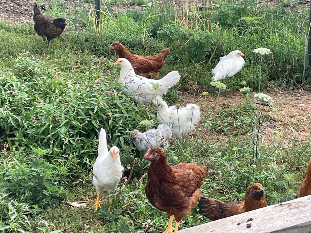 The laying hens are all healthy and growing fast. The white leghorn variety should begin laying first, most likely late August. We have named these lovely ladies more recently! That was fun and funny.