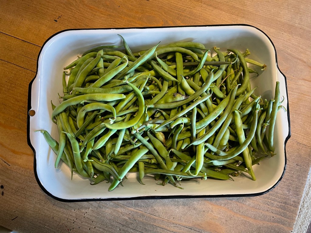 We have been picking and preserving green beans. So far, I have put up 24 pints. Last years’ yield was nice, but as it was bush beans, we didn’t grow as many as I’d hoped. A friend of my in laws welcomed us to come and pick theirs and we frenched those and canned many pints. We still have about 6 French style pints on the shelf. They make for good green bean casserole. But, I need to make some fresh green beans and new potatoes soon.