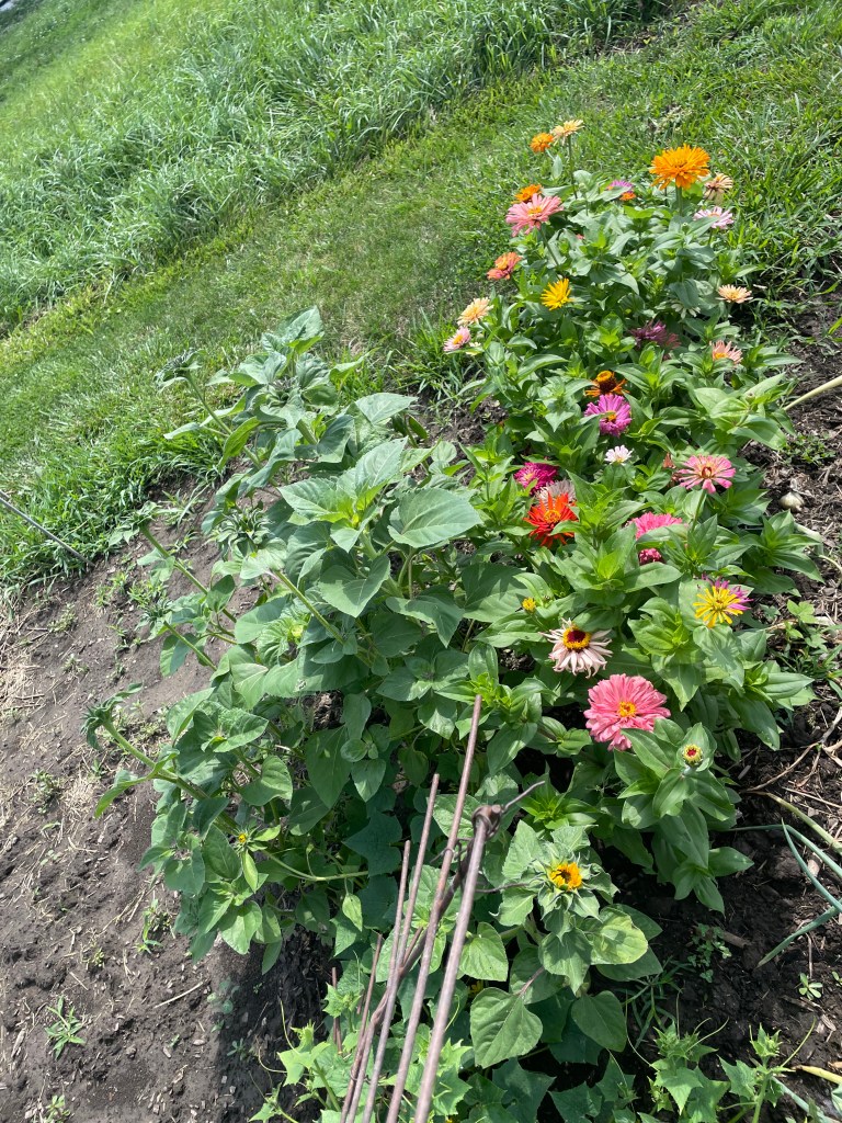 The flowers are lovely. My zinnias are attracting hummingbirds! That’s very fun to watch. The dwarf sunflower variety I planted looks ready to blossom any day now.