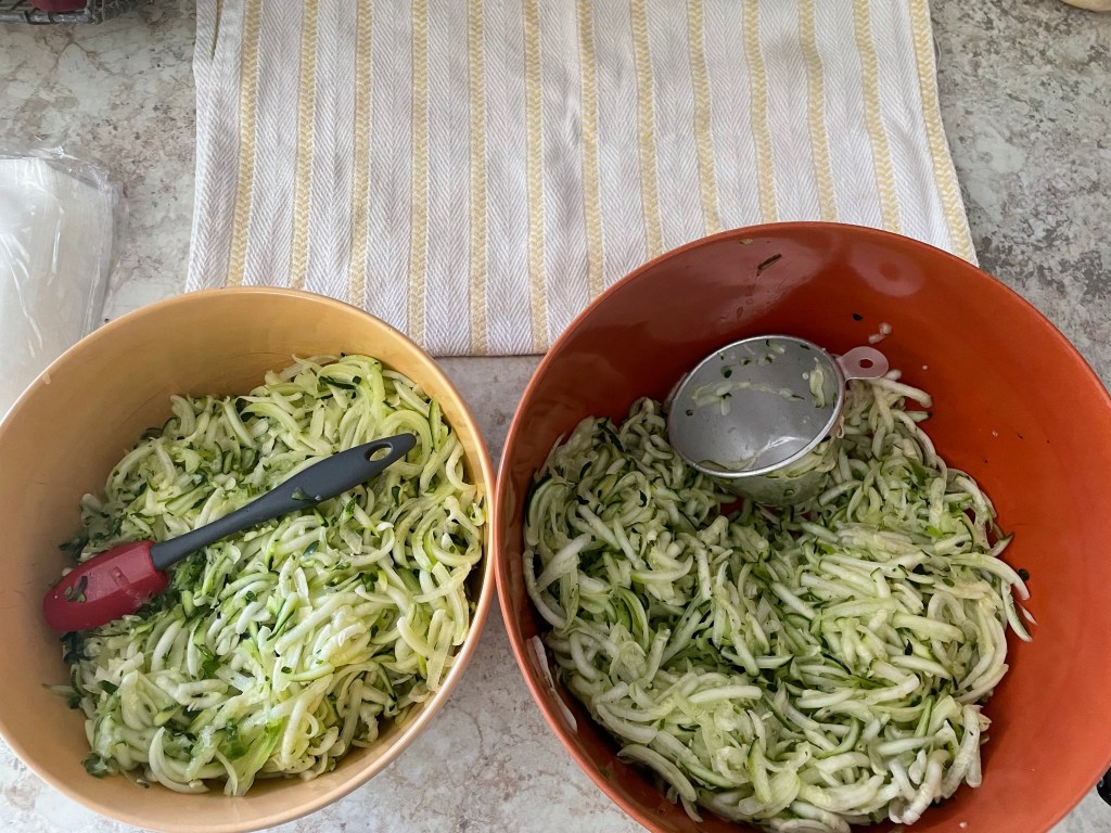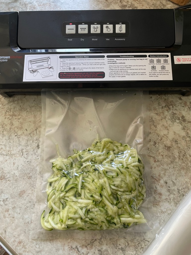 For shredding, I use my Kitchen Aid mixer with large shred attachment. Some people drain and squeeze all of the liquid out first. I do not. My vacuum sealer has a moist vac option that I have learned to use! I make 2 cup servings, seal, label, and freeze!
