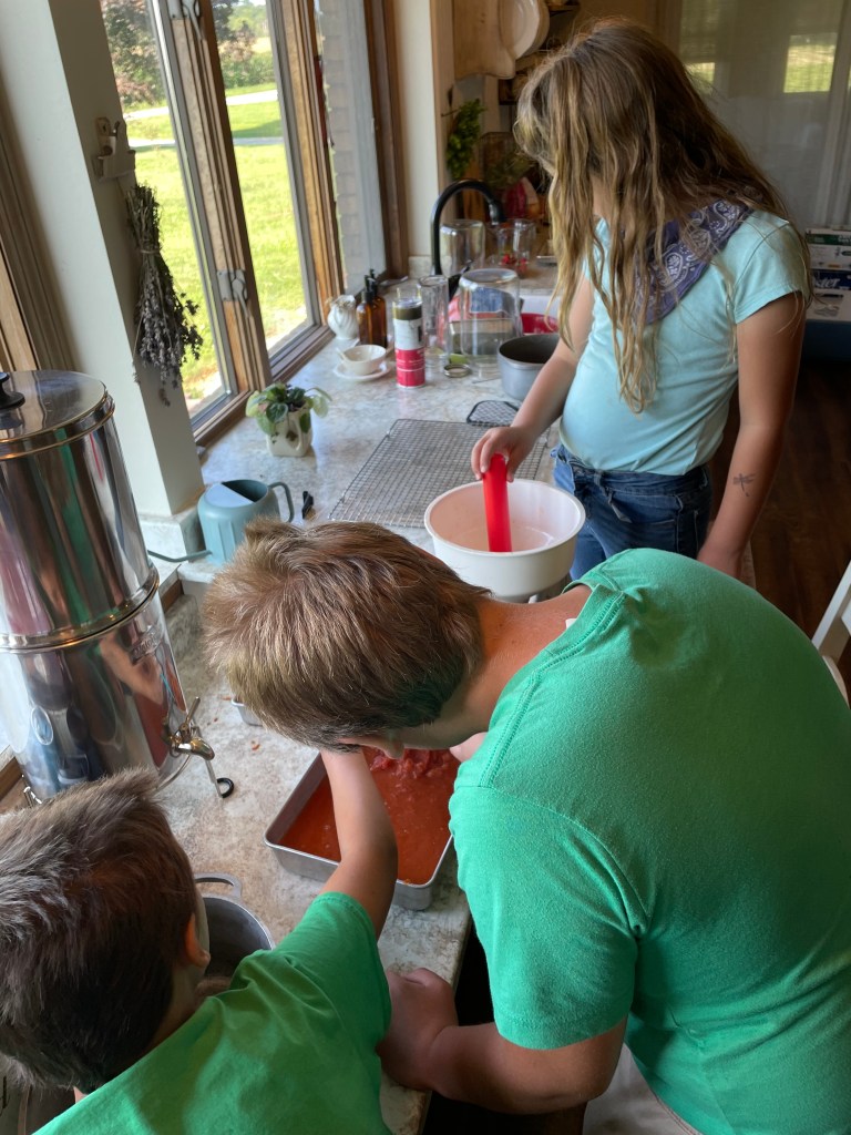 After the Romas are roasted, we drain them in a colander and sauce them with our sauce maker! It has come in very handy for preserving! The kids enjoy working it, which is lovely for me as well.