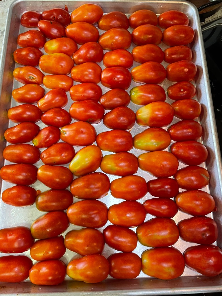 This year I decided to only grow two varieties: Roma and Cherokee Purple. I may regret this, but currently it is working ok! I like to be able to have the same sizes of sauce tomatoes for roasting. And the larger tomatoes are perfect for the salsa.