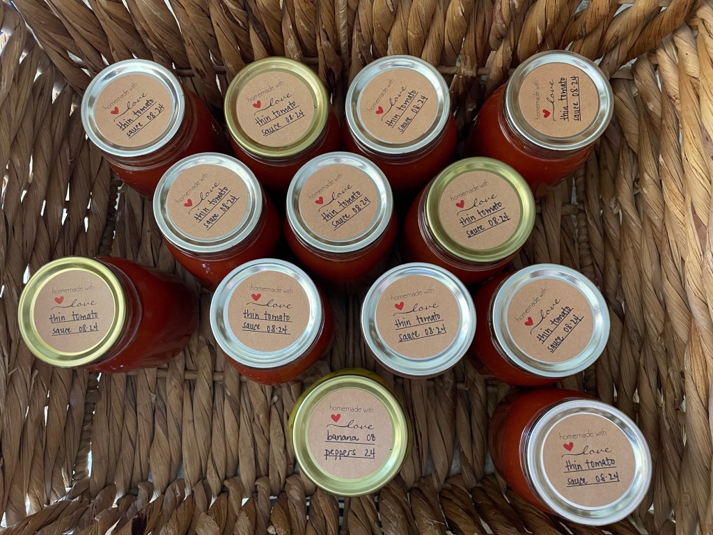 For the tomato sauce, we just cook it down to desired consistency and then pressure can it. You can also water bath can it! But I prefer being able to stack my pint jars which can only be done when pressure canning.