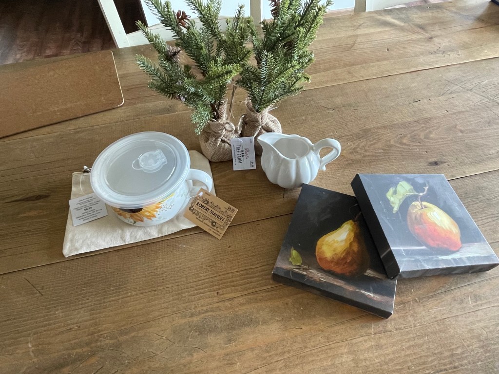 They had their Christmas 50% off and their fall 40% off. I chose two baby evergreen trees. I already have two and they’re one I love to use in our simplistic decor. I found a medium zippered canvas pouch. I keep a few of these on-hand for quick gift ideas. I enjoy embroidering on them. The pumpkin creamer was cute! But I got home and found a crack and a chip. That was sad, but not worth the 40 min drive to return it. The sunflower soup mug is a gift. Super fun!