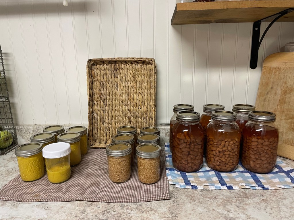 12:25 pm One thing I had one my list today was canning! I had soaked pintos and Jacob’s Cattle beans overnight to prepare them for pressure canning. It takes 90 minutes to can quart jars of beans. While I ‘babysat’ my canner I… read aloud history with my two youngest; cleaned a bit; and watched some free online summit courses from the School of Traditional Skills.