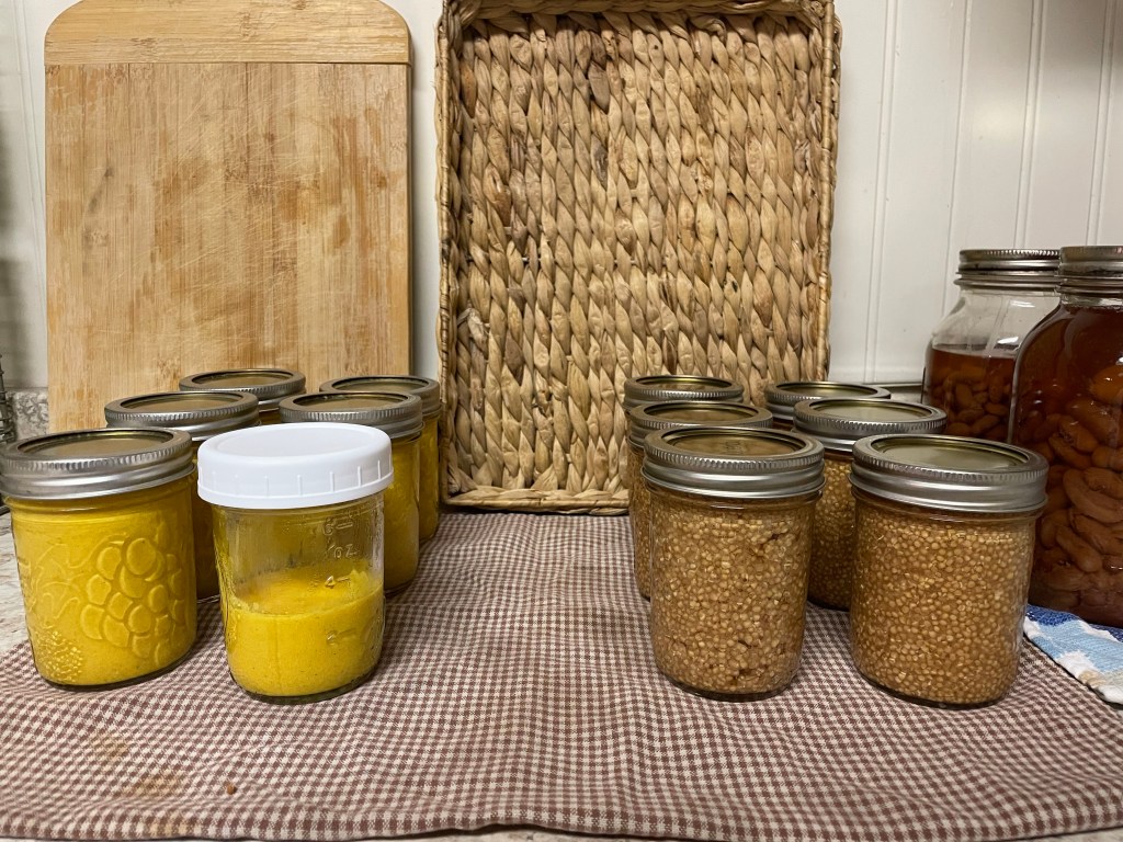 6:41 pm I pulled the last mustard out of the canner. Whew! Two batches- one of whole grain and one of yellow (made from powdered mustard). We had breakfast casserole for supper and listened to an audio theatre about the life of Martin Luther.