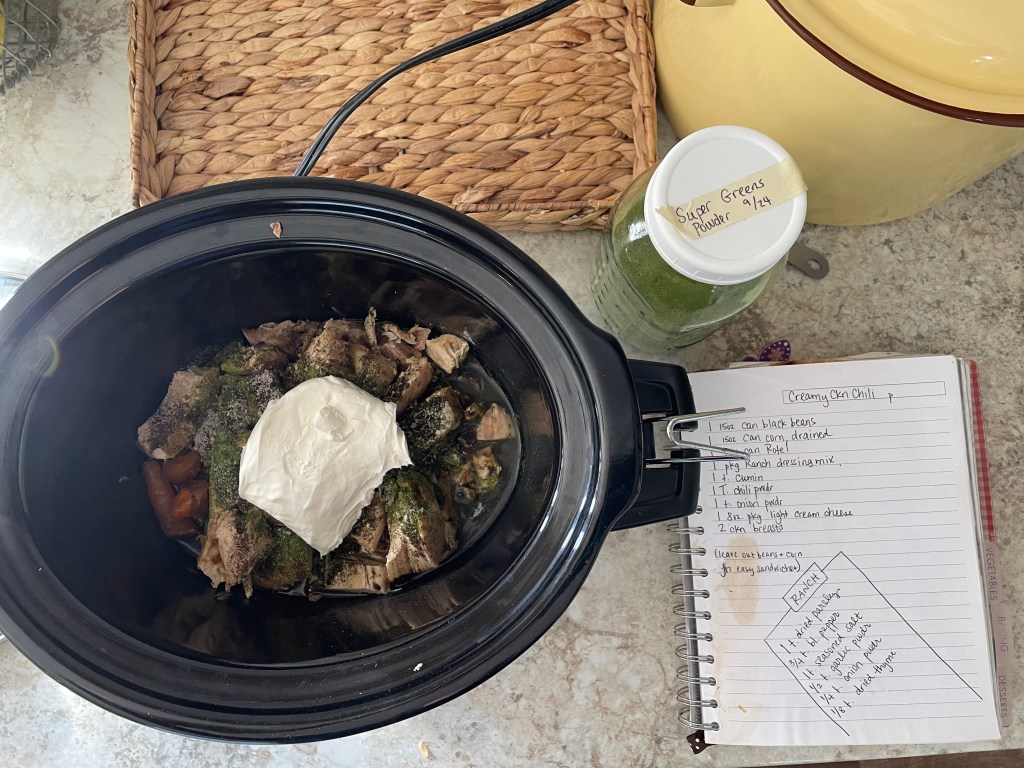 9:27 am I put lunch into the crock pot. Creamy ranch chicken. We ate it on half a roll with kraut and some cheesy fall shaped pasta. I threw a teaspoonful of my Super Greens powder into the pot for good measure.