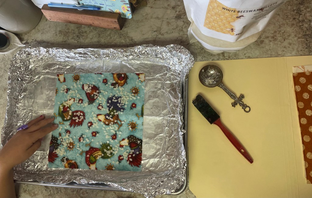 - Place fabric on pan. Put approximately 1 Tbsp on wax pellets onto your fabric (more if it’s larger).