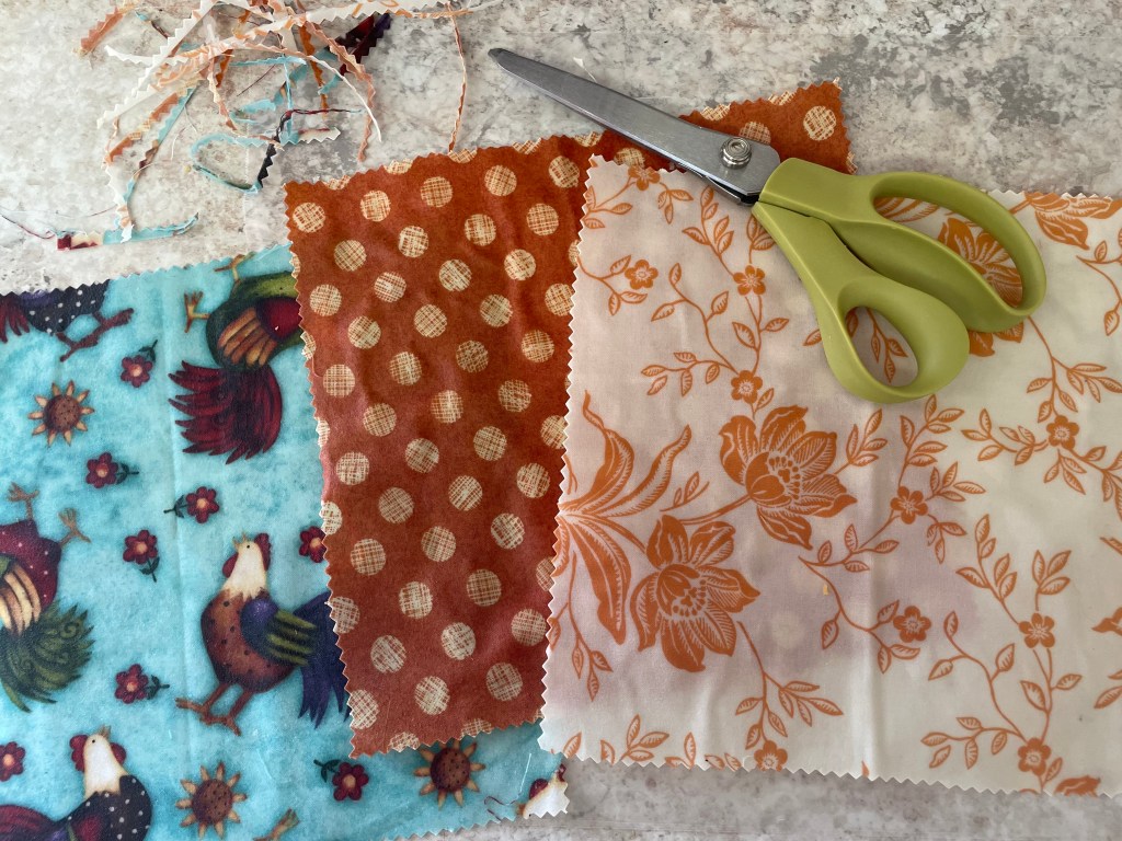 Alternatively, you could hang the wax covered fabric on a pasta rack to cool. Once cooled (after only a few minutes), trim edges.