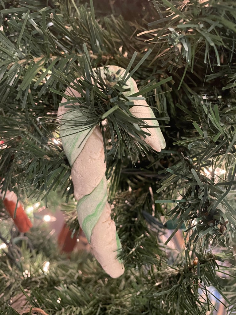 This candy cane is made from salt dough. Part we kept white and part we dyed green (or red!). Mold, bake, and let cool. Again, use an extra fine Sharpie marker to mark names and year!