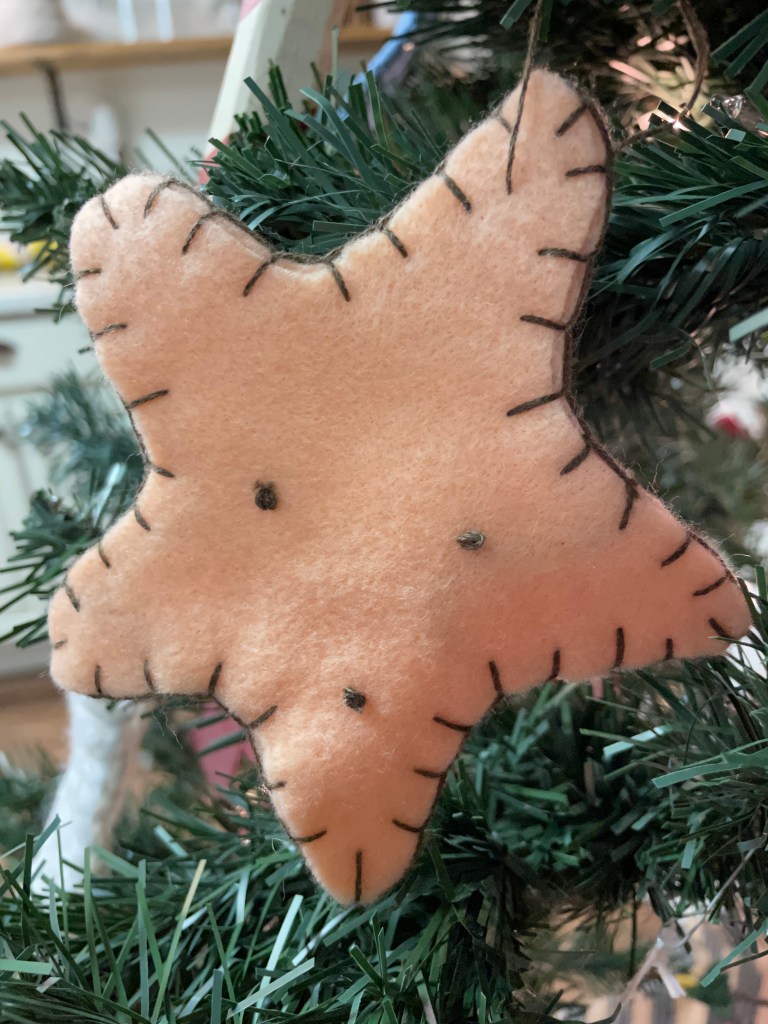 These felt stars are a favorite of mine to find in our Christmas box each year. I actually made these years before I was even married. I used a cookie cutter and traced onto felt (two pieces per ornament for double thickness) and did a simple blanket stitch around the edges.