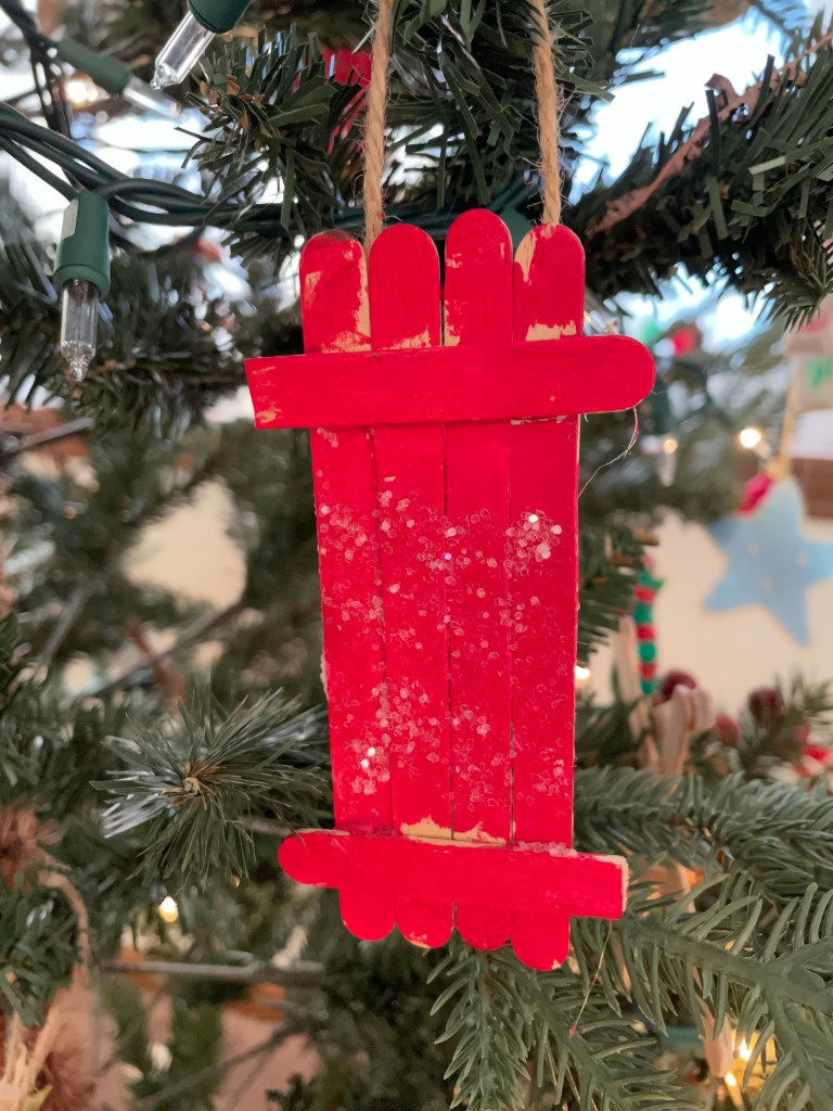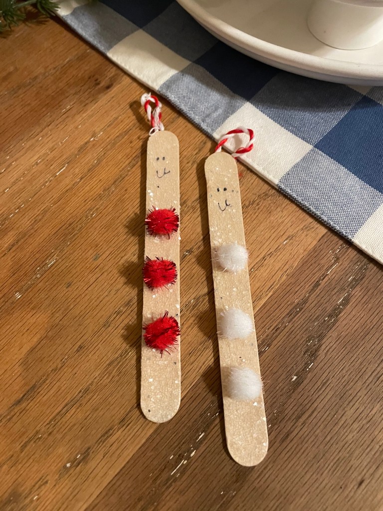 This is a version of the good ole popsicle stick sled. I was forgetting the runners so it looks more like a fence! But, my kids enjoyed the process and it’s a memory made! All ya need is paint, popsicle sticks, hot glue, and glitter! Be sure to write your child’s’ name on the back.