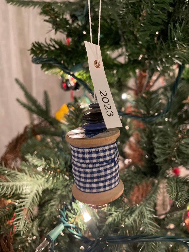 I made this one for our tree last year. Blue and white anyone? This one is an old wooden thread spool covered in ribbon. There is a jingle bell at the bottom, threaded through the spool. And on top are some blue buttons, also threaded. I added the year on a small piece of cardstock.
