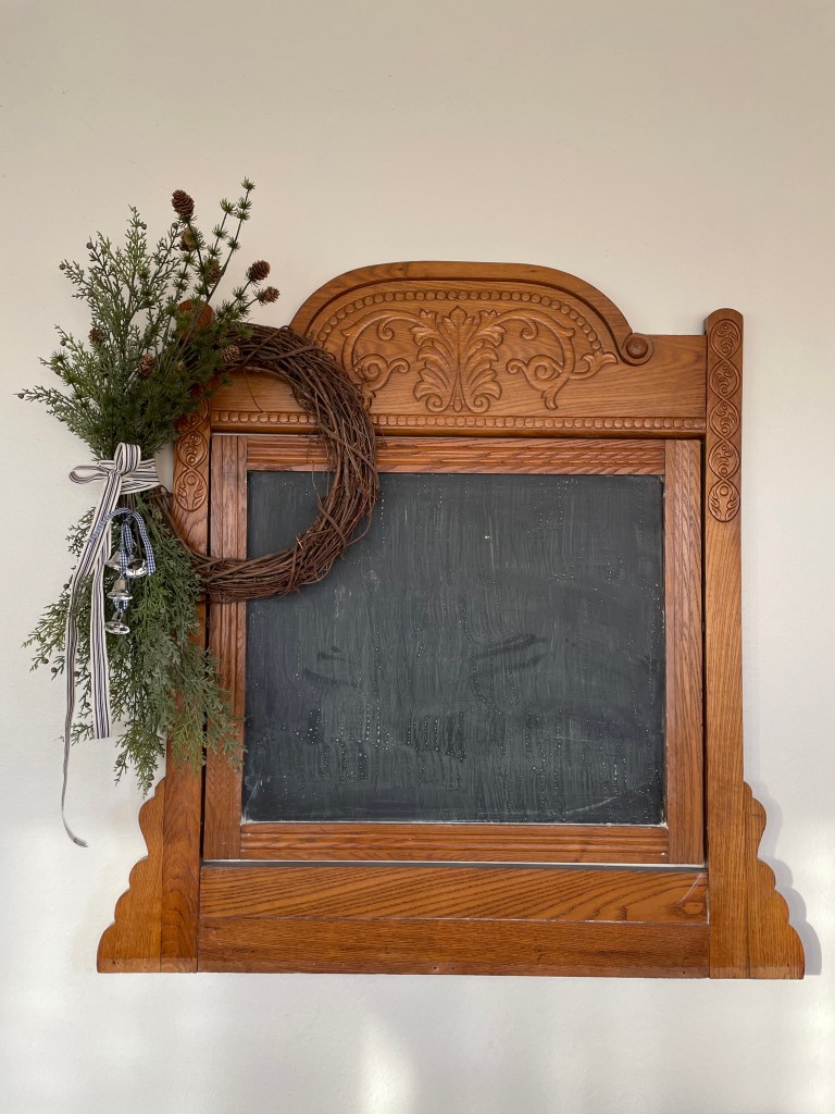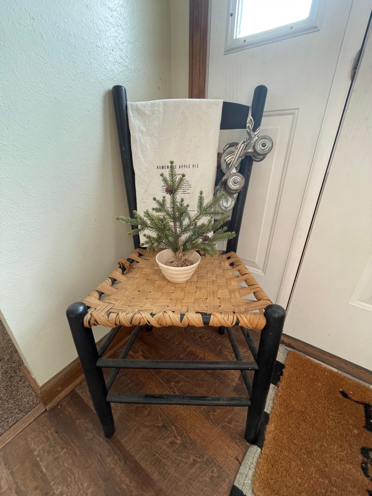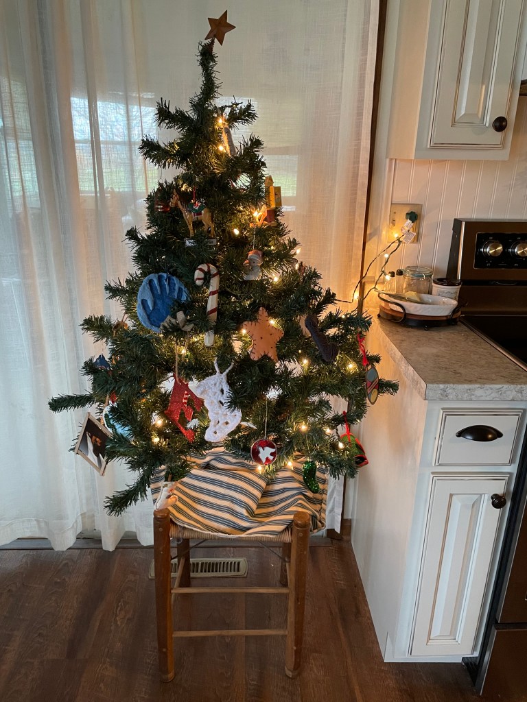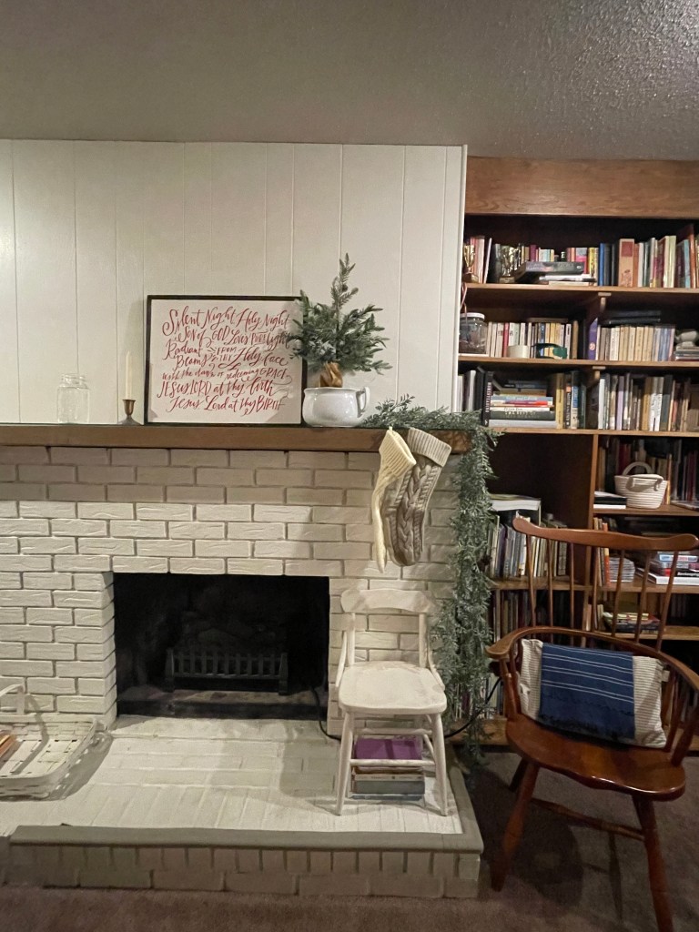 Our very simple mantle decor this year… note only two stockings. The kids’ stockings hang on a primitive peg rack near the hearth.