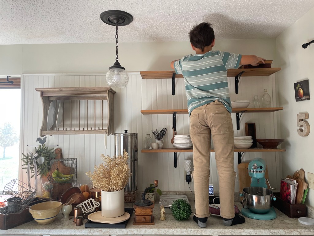My ten year old helped get fall things from up high and dust for me.