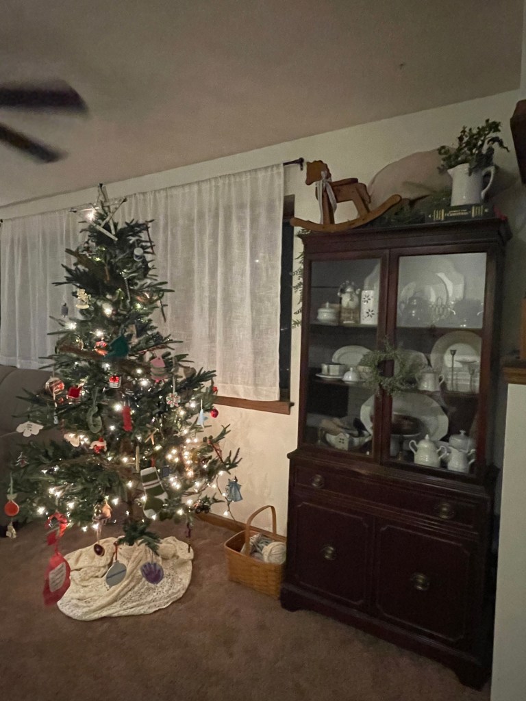 And, our large tree! I added Christmas to the cabinet as well! Note my less-than-traditional star at the top. We were out a few lights toward the top when this photo was taken.