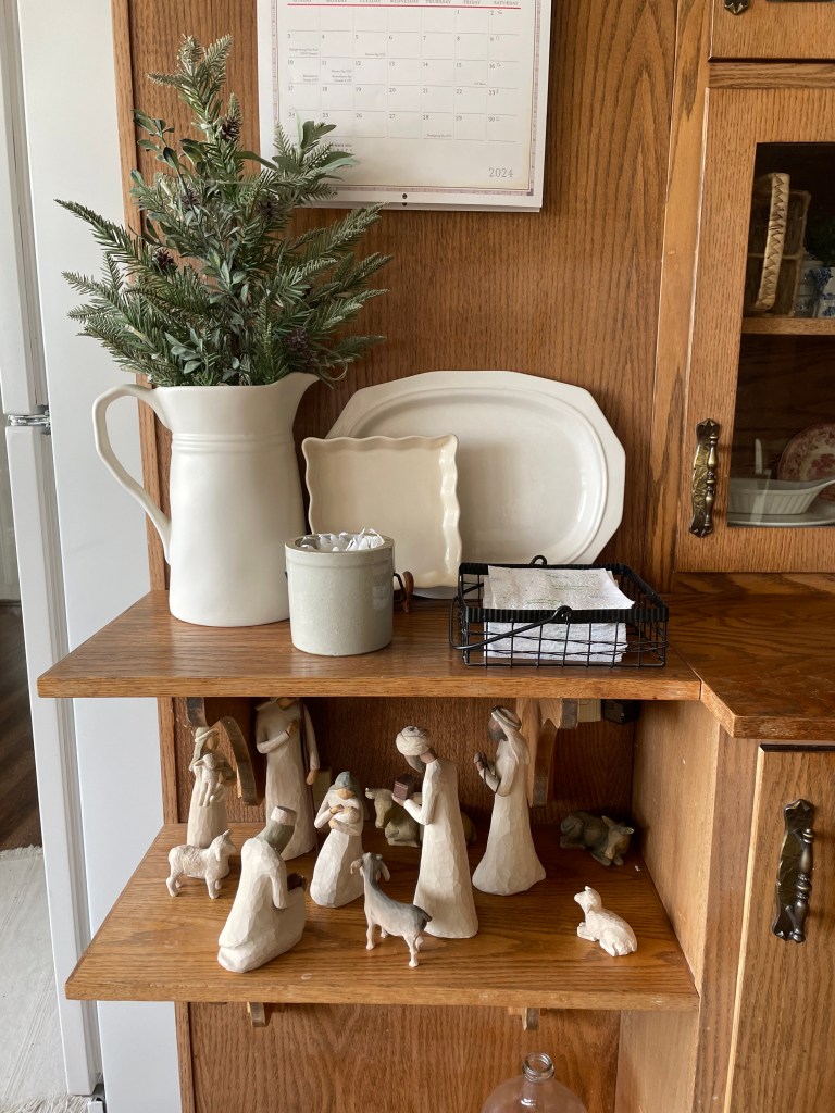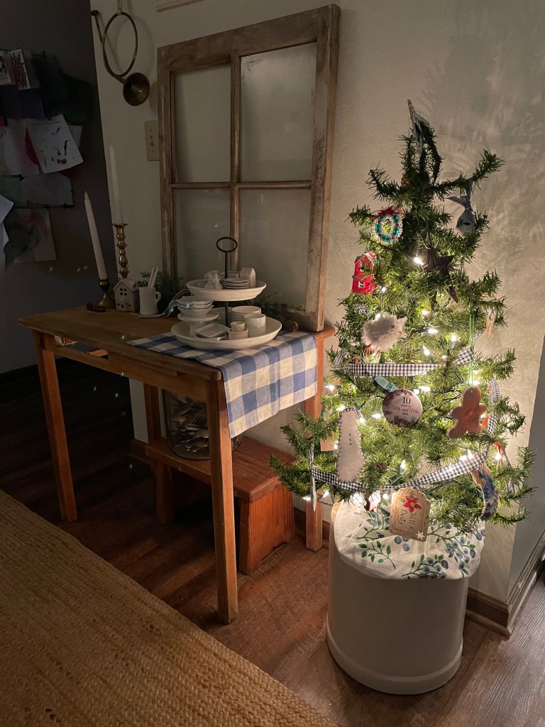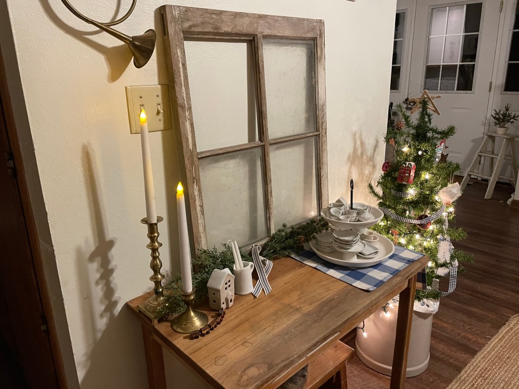 Our new wee table in place and decorated also! And yes- I add blue and white at Christmas too!