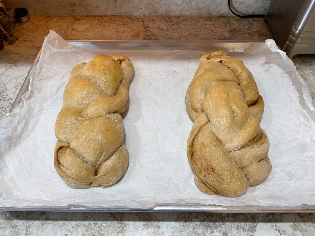 Braided cinnamon bread, baked for church fellowship snacks. I made a simple icing to drizzle over the top for serving.