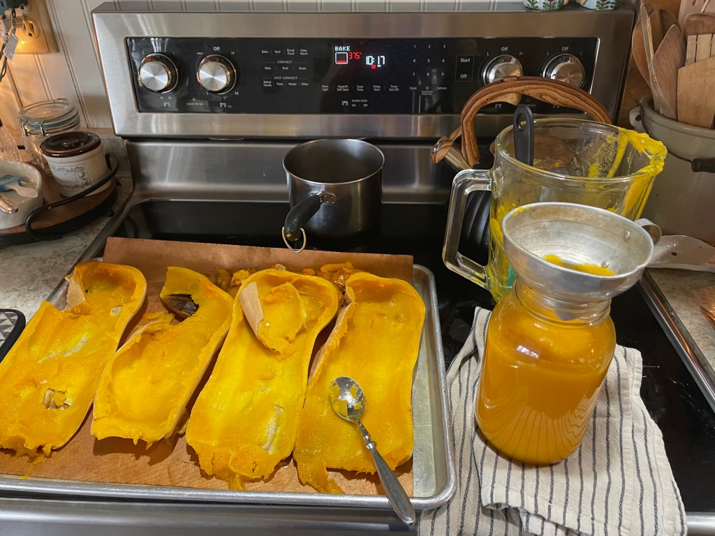 Baking some homegrown butternut squash to be used in soup, chili, bread… The color of these is rich and luscious!