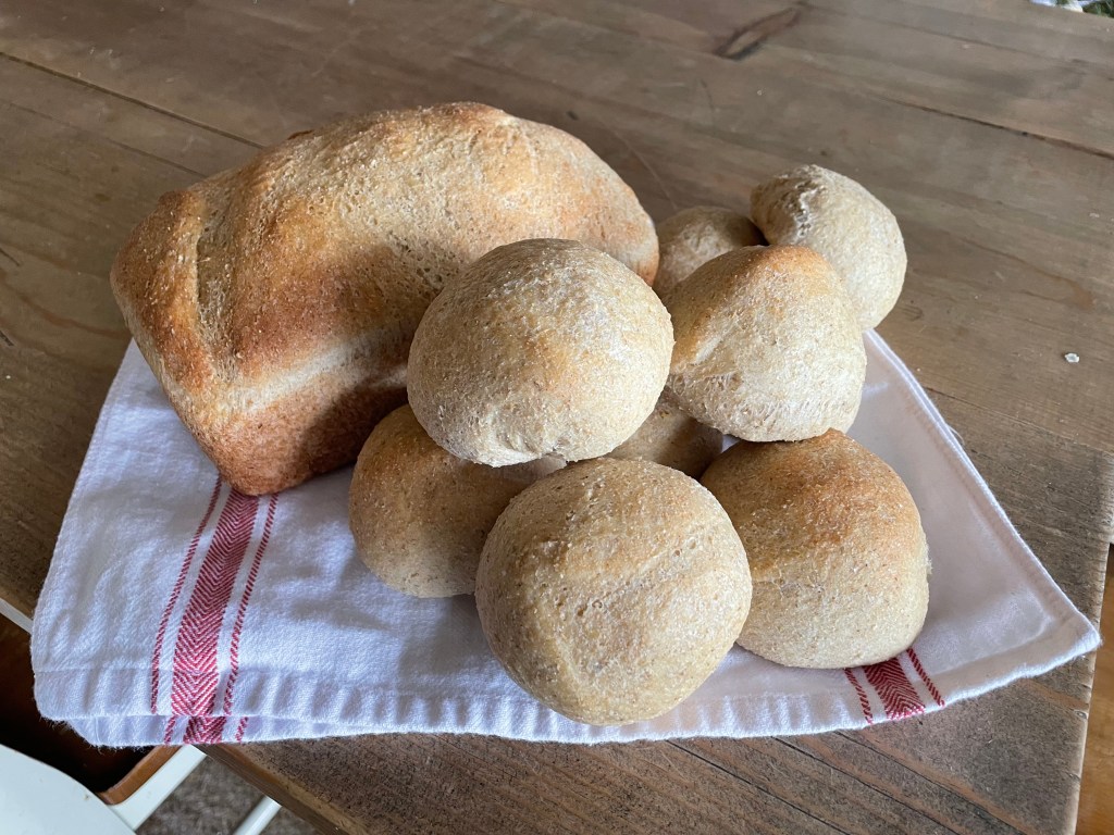 Baking day! I was able to grind some flour and bake one loaf and 9 rolls. I also coarsely ground some wheat berries for homemade ‘cream of wheat’. We will try it soon!