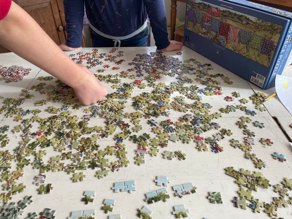 We began a puzzle! It’s a bigger one than we’ve worked before- 750 pieces. I love the laundry line.