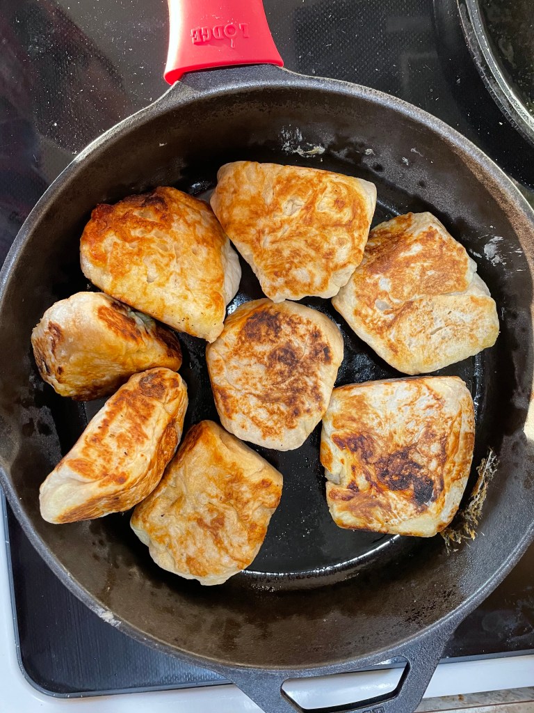 - After 2 minutes or so, flip. They will continue to cook. You may need to turn the heat down at this point. I have also flipped mine on their sides to be sure they cook all the way through.