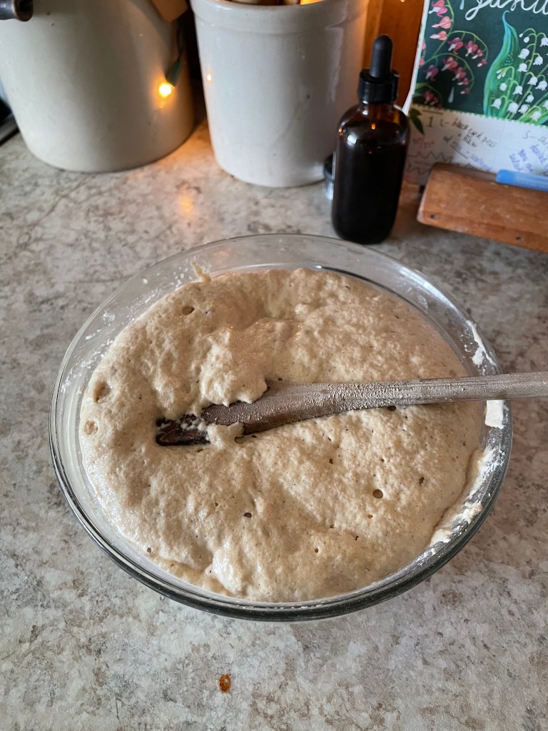 - Mix SD starter, water, and flour in a glass bowl. Cover with lid or bowl cover and let sit 12-24 hours.