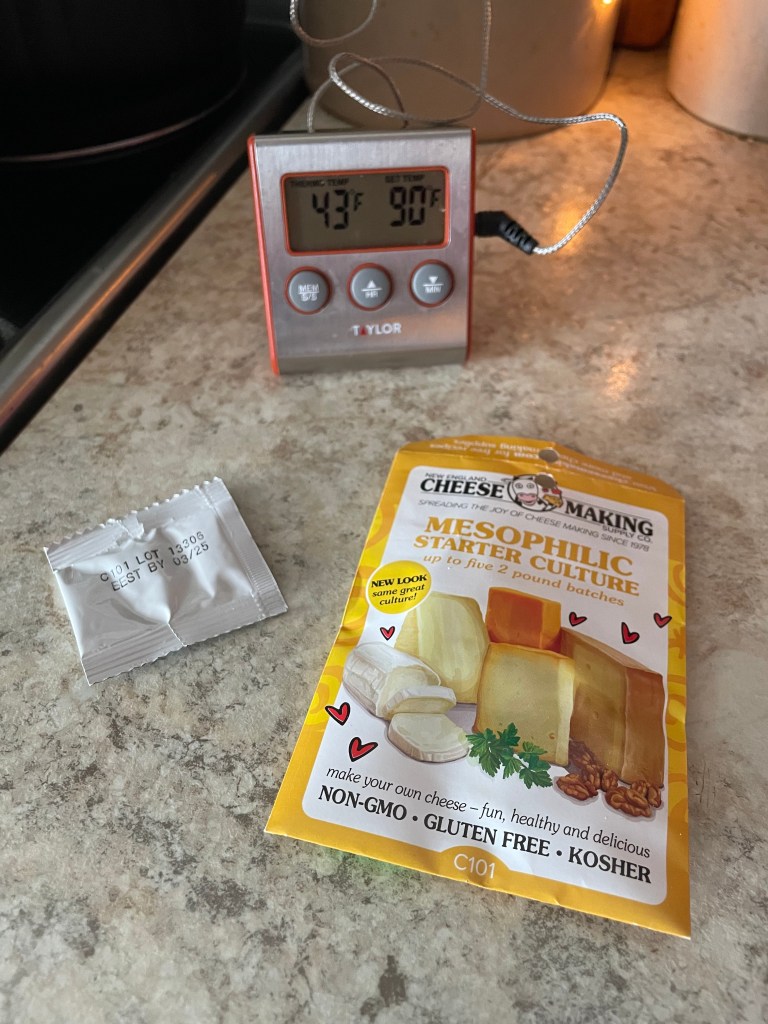 You will only need a few items to make this cheese. I am not to the point where I can keep a clabber culture on hand (we do not have our own dairy animal), so I purchase cultures to use for cheesemaking.