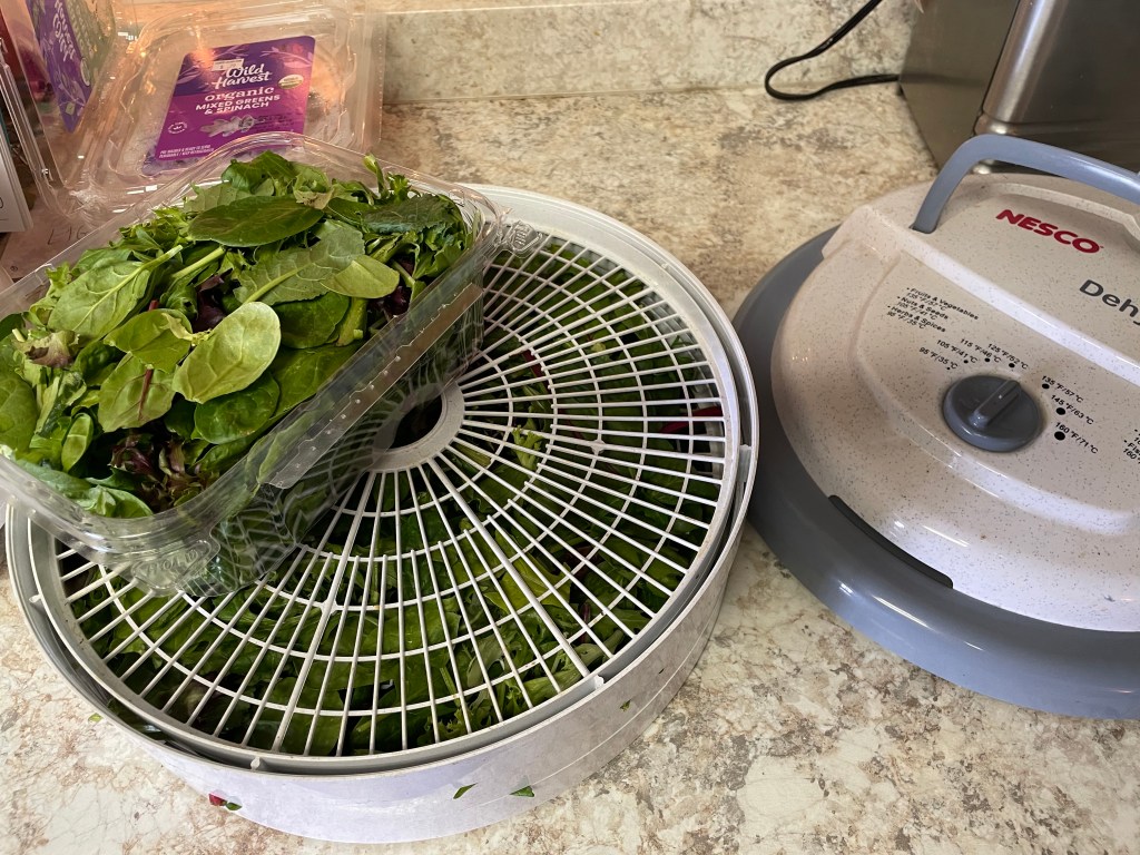 The containers I got were a mixture of greens- lettuces, spinach, arugula, etc. I am picky to get this type of green organic because it falls into the ‘dirty dozen’ list of most pesticide sprayed fresh foods. These packages were prewashed and ready to go! So, I took one container per dehydrator tray (I have this dehydrator plus two additional trays) and spread the greens on thickly. I only ended up with a small handful that didn’t dry completely… the hens got those!