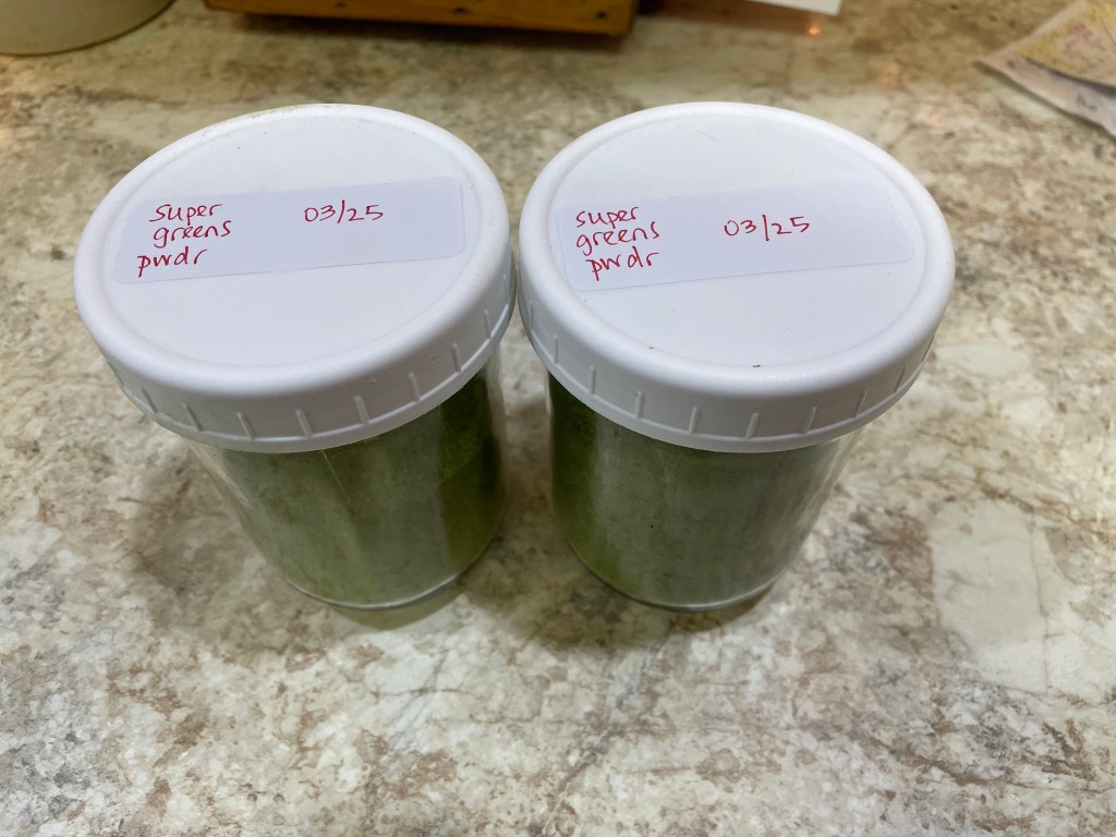 Next, dry the greens. I set mine at 135* (veggie setting). It takes around 10-12 hours. I usually let mine go overnight and check in the morning. Once they are completely crunchy-dry, I add them to a blender (my 11 year old helped with this part) and process them into powder. Each batch (7 boxes of 5 oz. greens=7 trays) yielded about 3/4 pint of powder. Label and store! Be sure the powder is dry before adding a lid. Sometimes the heat of the blender can be tricky, but nothing too hot.