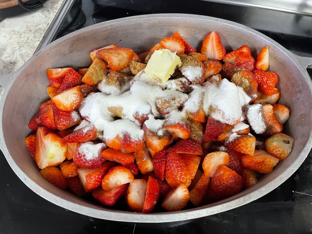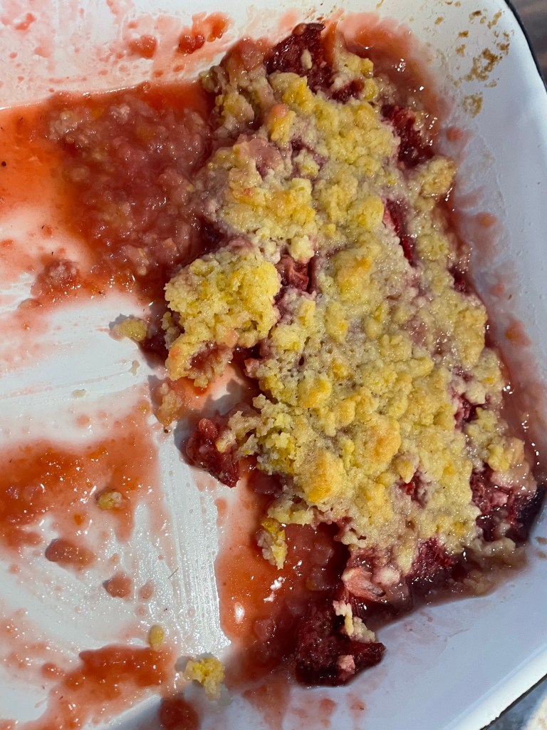 The next item of strawberry business was a crisp for DESSERT. My 11 year old is on a kick for wanting to do all of the dessert making. We used a recipe from a neighbor for rhubarb crisp and changed it to use our berries instead. Let me tell you… this was an absolute dream. It tasted like a sort of pudding and I couldn’t get enough. Amazing!!