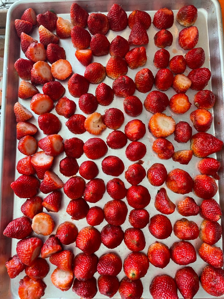The first item of business was JAM. We have chatted jam before, haven’t we? I began right away washing and cutting the berries. Many were fresh eating worthy- most were what I would call ‘seconds’ and perfect for processing into other things.